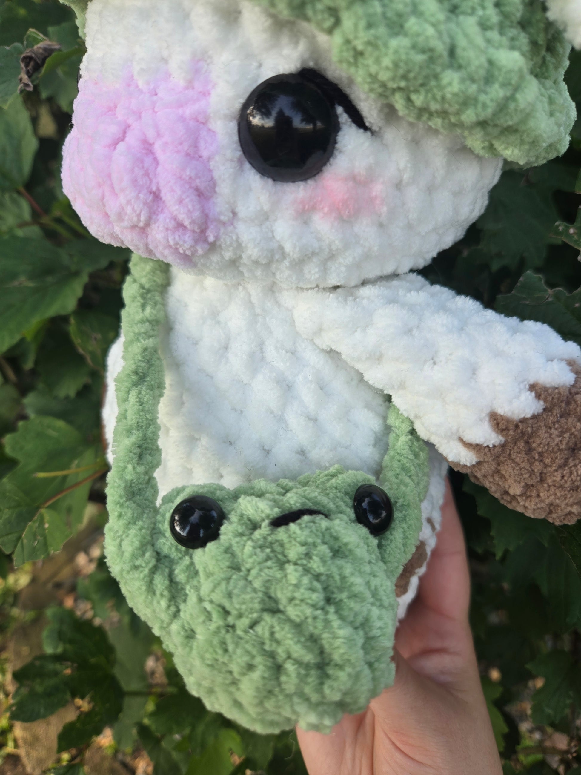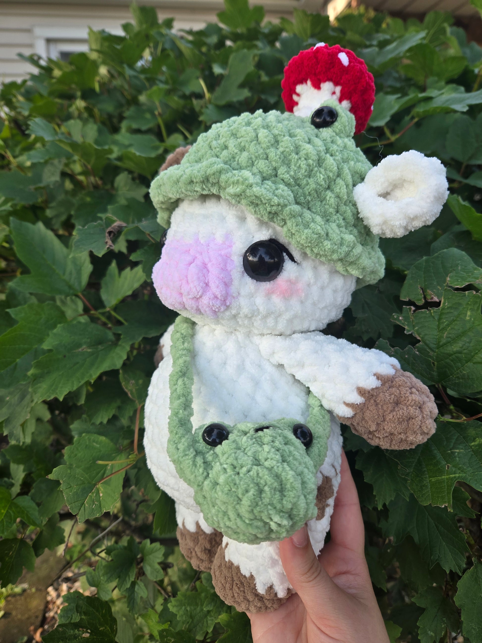Cottage core cow. The is cow has a removable frog hat and bag.